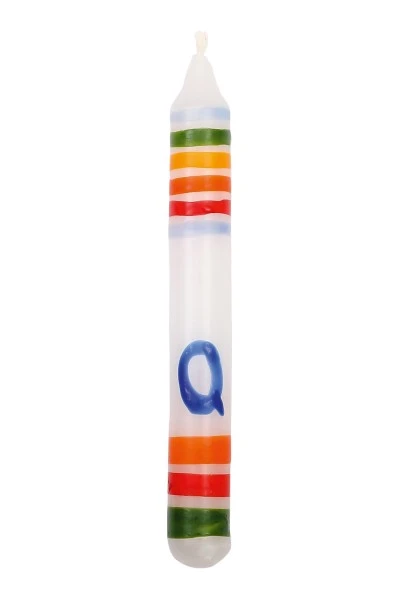 Eine Kerze mit dem Buchstaben Q in schönen lebendigen Farben. Die tolle kleine Kerze ist wunderbar fröhlich gestaltet und begeistert mit schönen Kontrasten.