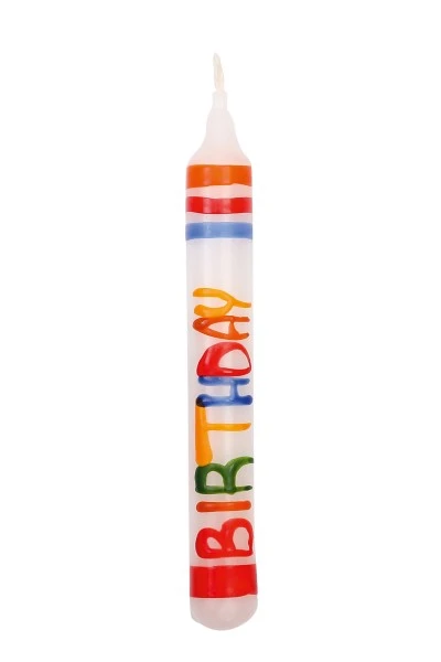 Eine weiße Kerze mit bunten Ringeln. Hübsche Kerzen peppen Geburtstagsringe noch einmal besonders auf!