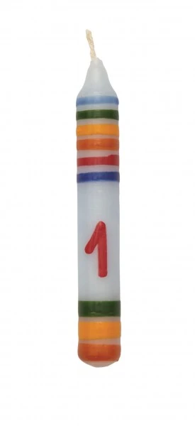 Eine Kerze mit der Zahl 1, Typ Hellblau in schönen lebendigen Farben. Die tolle kleine Kerze ist wunderbar fröhlich gestaltet und begeistert mit schönen Kontrasten.