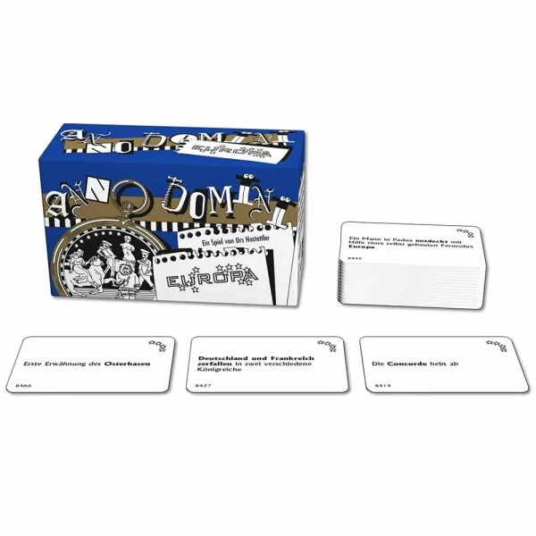 Bei Anno Domini müssen Ereignisse in die richtige zeitliche Abfolge gebracht werden. Es kommt dabei jedoch nicht auf exaktes Wissen an. Denn wer weiß schon, ob „der Osterhase das erste Mal erwähnt wurde“ bevor oder nachdem „ein Mann in Padua mit Hilfe eines selbst gebauten Fernrohrs Europa entdeckte“. Wer gut bluffen kann hat beste Chancen seine Karten als Erster loszuwerden und damit zu gewinnen. Die richtige Mischung aus bekannten und kuriosen Ereignissen garantiert jede Menge Spaß für die ganze Familie.