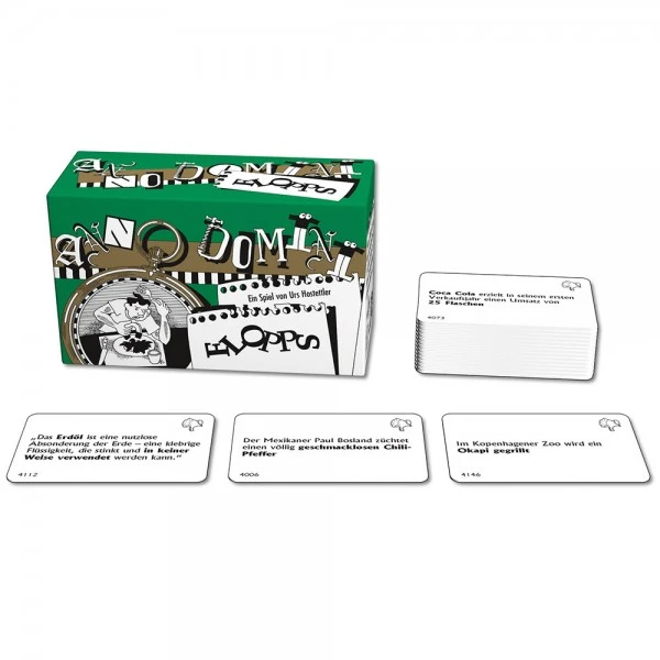 Bei Anno Domini müssen Ereignisse in die richtige zeitliche Abfolge gebracht werden. Es kommt dabei jedoch nicht auf exaktes Wissen an. Denn wer weiß schon, ob „die Schwangere Auster zusammen gebrochen ist“ bevor oder nachdem „am englischen Hof der erste Tee – als Gemüse – serviert wurde“. Wer gut bluffen kann hat beste Chancen seine Karten als Erster loszuwerden und damit zu gewinnen. Die richtige Mischung aus bekannten und kuriosen Ereignissen garantiert jede Menge Spaß für die ganze Familie.
