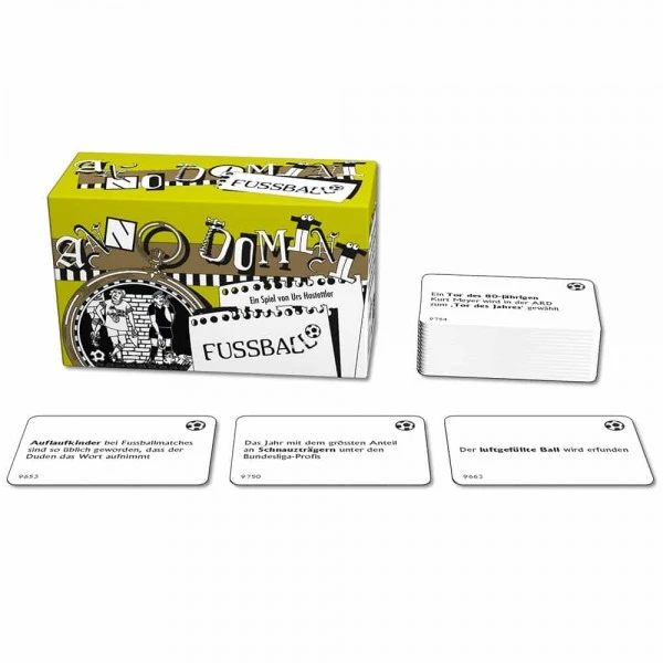 Anno Domini – Fussball von Urs Hostettler Bei Anno Domini müssen Ereignisse in die richtige zeitliche Abfolge gebracht werden. Es kommt dabei jedoch nicht auf exaktes Wissen an. Denn wer weiß schon, ob „das Jahr mit dem grössten Anteil an Schnauzträgern unter den Bundesliga-Profis“ war bevor oder nachdem „Auflaufkinder bei Fussballmatches so üblich geworden sind, dass der Duden das Wort aufgenommen hat“. Wer gut bluffen kann hat beste Chancen seine Karten als Erster loszuwerden und damit zu gewinnen. Die richtige Mischung aus bekannten und kuriosen Ereignissen garantiert jede Menge Spaß für die ganze Familie. Spieldauer ca. 30 Minuten Empfohlen ab 10 Jahren Für 2 bis 8 Spieler Inhalt: 340 Karten, 1 Spielregel
