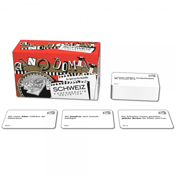 Bei Anno Domini müssen Ereignisse in die richtige zeitliche Abfolge gebracht werden. Es kommt dabei jedoch nicht auf exaktes Wissen an. Denn wer weiß schon, ob „die ersten Kühe das Matterhorn erblickten“ bevor oder nachdem „Johanna Spyri Heidi schrieb“. Wer gut bluffen kann hat beste Chancen seine Karten als Erster loszuwerden und damit zu gewinnen. Die richtige Mischung aus bekannten und kuriosen Ereignissen garantiert jede Menge Spaß für die ganze Familie.