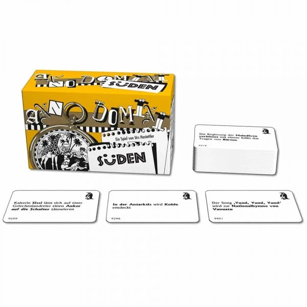 Bei Anno Domini müssen Ereignisse in die richtige zeitliche Abfolge gebracht werden. Es kommt dabei jedoch nicht auf exaktes Wissen an. Denn wer weiß schon, ob etwa „auf den Malediven das Tragen von Bärten verboten wurde“ bevor oder nachdem „in der Antarktis Kohle entdeckt wurde“. Wer gut bluffen kann hat beste Chancen seine Karten als Erster loszuwerden und damit zu gewinnen. Die richtige Mischung aus bekannten und kuriosen Ereignissen garantiert jede Menge Spaß für die ganze Familie.