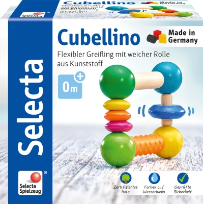 Der Selecta Greifling Cubellino verbindet Klang, Beiß- und Greiferfahrungen zu einem tollen Gesamtkonzept. BPA-freies Silikon und schönes glattes Holz sorgen für wunderbare sinnliche Erfahrungen, die die Kids immer wieder zum Spielen mit diesem ganz besonderen Greifling motivieren.