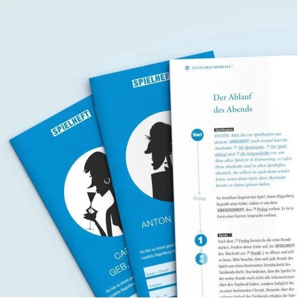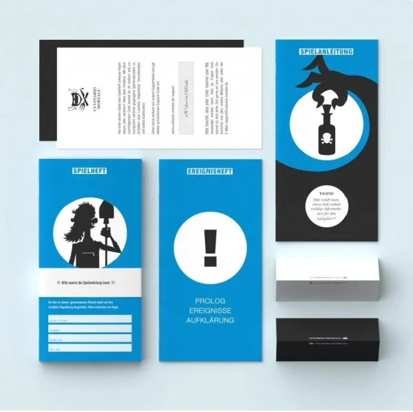 • Inhalt: 1 Spielanleitung, 8 Spielhefte, 1 Ereignisheft (beinhaltet Prolog, Ereignisse und Auflösung), 8 Namensschilder, 1 Support-Code
