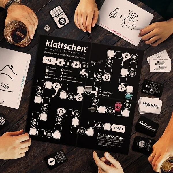 Klattschen von den Denkriesen ist ein launiges Kartenspiel mit einfachen Regeln. Dabei muss immer wieder getrunken werden – dabei können es alkoholische oder nichtalkoholische Getränke sein.