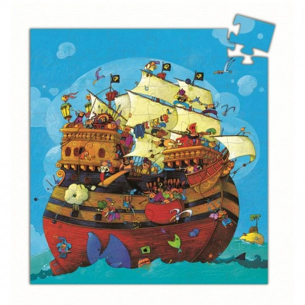 Hurra die Piraten stechen in See! Und zwar mit einem über und über beladenen Boot, auf dem es viel zu entdecken gibt. 54 Teile liegen bereit und warten darauf zu einem tollen Bild zusammengefügt zu werden. Ein spannendes Puzzle für Kinder ab 5 Jahren. Sie können Teil für Teil zusammensetzen bis die Piraten, die das Boot, die Segel, die Kanonen und noch vieles mehr zu sehen sind. Mit jedem Puzzleteil, das dazu kommt, gibt es etwas Neues zu entdecken. Ist das Motiv komplett, können fantastische Geschichten mit den zu sehenden freundlichen Halunken ausgedacht werden: Wo die Piraten wohl hinsegeln? Hast Du schon gesehen was der Kapitän in der Hand hält? Und heidewitzka – was da alles für Gefahren auf dem Meer lauern!? Gerade für die kalte Jahreszeit ein prima Zeitvertreib für Kinder, durch den Konzentration und Ausdauer unter Beweis gestellt werden können. Auch als Geschenk eignet sich das Puzzle super, denn es ist ganz wundervoll verpackt – nämlich in Piratenschiffform. So verbreitet die Geschenkverpackung später auch im Regal Angst und Schrecken!