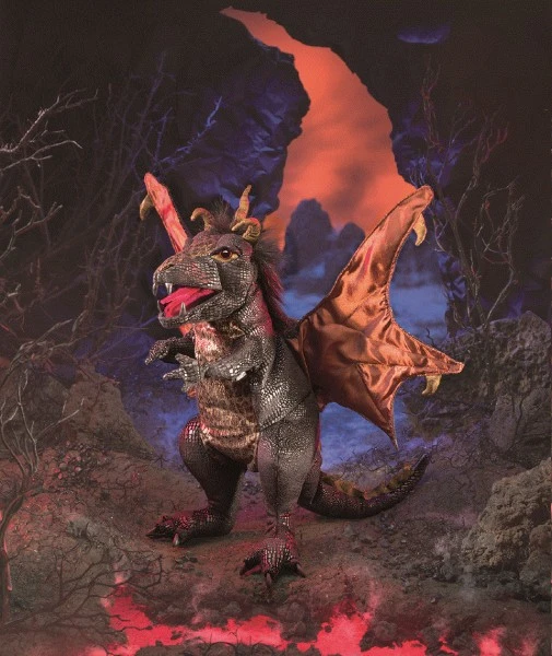 Mit ein bisschen Hilfe kann der Drache zum Leben erweckt werden. Einfach mit der Hand in die Öffnung an der Unterseite des Tierkörpers schlüpfen und die Finger bewegen. Schon bewegt sich auch der Drache. Maul, Zunge und Arme können vor Allem bespielt werden. Ein besonderes Extra wird sichtbar, wenn man an der Schnur am Drachenschwanz zieht – glänzende Drachenflügel breiten sich aus. Flieg mit dem Drachen, wohin dich deine Fantasie trägt!