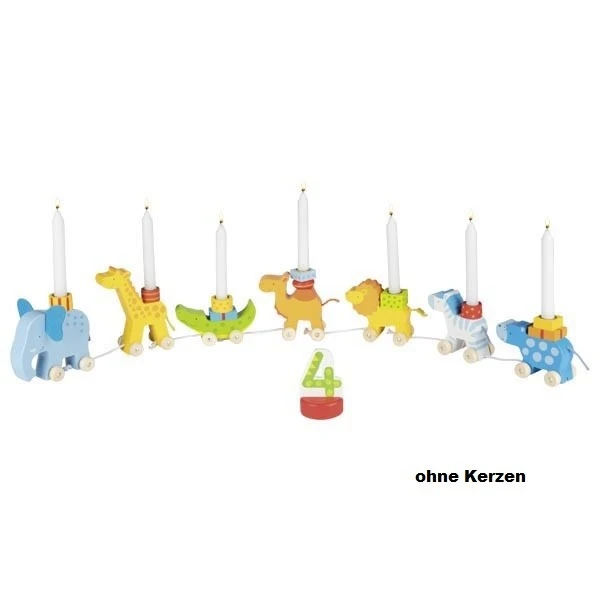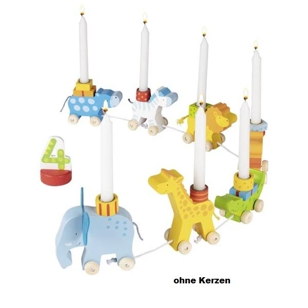 Der lustige Geburtstagstierzug zieht über den Tisch des Geburtstagskindes. Elefant, Giraffe, Krokodil, Kamel, Löwe, Zebra und Bär sind eine fröhliche bunte Dekoration. Auf den Rücken der Tiere können Kerzen gesteckt werden (Baumkerzengröße). Auf einem kleinen Sockel wird die aktuelle Geburtstagszahl präsentiert.