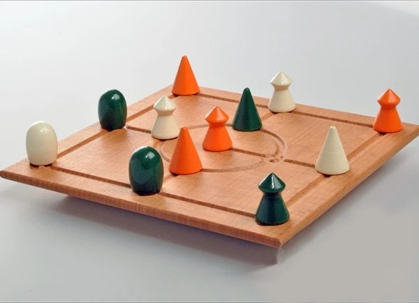 Spielbrett 14,5 x 14,5 cm, lackierte Spielsteine, 24 Aufgabenkarten