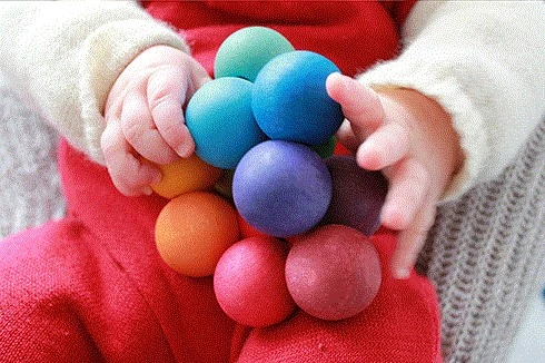 Diese farbenfrohen Holzkugeln sind flexibel miteinander verbunden und lassen sich drehen und drücken. Interessante Kugeln und Formen für kleine Entdeckerfinger.