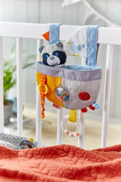 Es lässt sich gut aufhängen, z.B. am Babybettchen. Der Waschbär kann als Spielfigur heraugenommen werden.