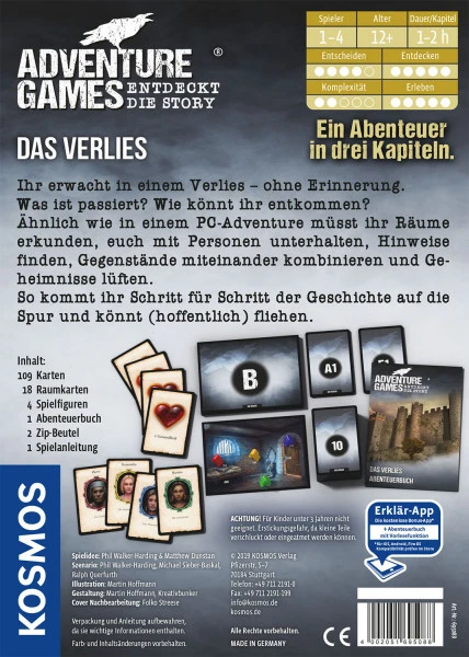 • Inhalt: 1 Abenteuerbuch, 109 Abenteuerkarten, 18 Raumkarten, 4 Spielfiguren, 2 Zip-Beutel, 1 Spielanleitung