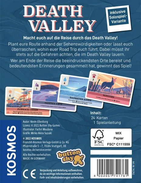Das kurzweilige taktische Kartenspiel Death Valley von Kosmos ist besonders gut für 2 Personen geeignet. Die Spielerinnen und Spieler planen mit Wüstenkarten ihren Road Trip durch das Death Valley und sammeln Erinnerungen in ihrem Album. Dabei sammeln sie Punkte, besondere Fähigkeiten und interessante Fakten über das Death Valley. Auf jeder Karte steht zudem eine Gefahr, die die eigenen Entscheidungen beeinflusst und eventuell zum Abbruch der Reise führt. Die richtige Taktik, Glück und Mut zum Risiko entscheiden über den Ausgang des Spiels. Das Spiel im Taschenformat ist zu zweit oder solo spielbar.