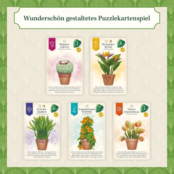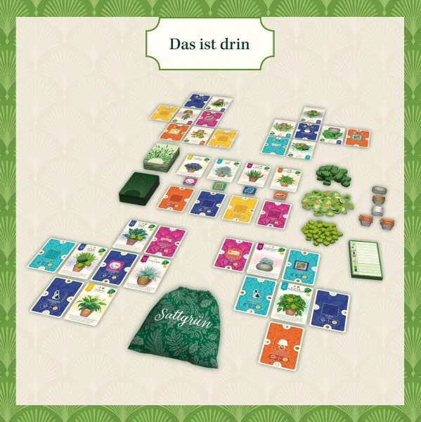 Sattgrün heißt dieses ansprechende Familienspiel für 2-4 Personen ab 10 Jahren aus dem Kosmos Verlag. Die schönen Pflanzen- und Einrichtungskarten werden strategisch für das grünste Zuhause ausgelegt. In welchem Zuhause ist es besonders grün und gemütlich? Zimmerpflanzen werden so platziert, dass ihre Lichtbedürfnisse möglichst erfüllt werden. Je besser die Pflege, desto grüner sprießt es. Im Familienspiel wählen die Spielerinnen und Spieler in jedem Zug eine Kombination aus einer Zimmer- oder Pflanzenkarte und einem Einrichtungsgegenstand. Die Kartenauslage – das Zuhause – wächst. Aber Achtung! Es gibt mehrere Ziele zu beachten, um das Grün zu vermehren. „Grüne Daumen« bieten in diesem Gesellschaftsspiel weitere Aktionsmöglichkeiten. • mit 1-Personenvariante • Inhalt: 60 Pflanzenkarten, 60 Zimmerkarten, 30 Aufgabenkarten, 15 weitere Karten, 162 Kartonplättchen, 60 Blätter aus Holz, 1 Wertungsblock, 1 Stoffbeutel, 1 Spielanleitung