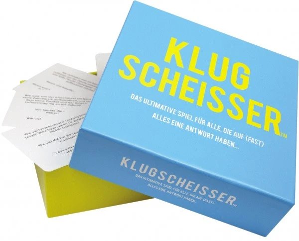 Wie viel Klopapier verbrauchen wir jährlich? Keine Ahnung? Wir auch nicht Aber dafür machen die Fragen, auf die man nicht unbedingt gleich eine Antwort weiß, einen Riesenspaß! Klugscheißer – das Spiel für alle, die auf (fast) alles eine Antwort haben! Ideal für eine gesellige Runde!