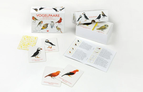 Das ideale Geschenk für Vogelliebhaber: In diesem wunderschön illustrierten Memo-Spiel geht es darum, die passenden Männchen und Weibchen einer Vogelart zusammenzubringen. Mit zahlreichen Arten von Schleiereule bis Ara.