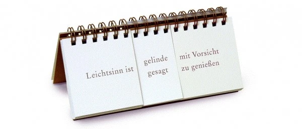 Mit diesem Endlos-Thesen-Generator ist jedes Gespräch gerettet, egal ob Smalltalk mit einem Fremden, in einer größeren Runde oder mit sich selbst. Denn auf diese hochstrittigen Aussagen kann nur eine intelligente und vielschichtige Diskussion folgen. Durch wohlüberlegte Wortauswahlen hat die Autorin und Journalistin Pia Frey in diesem Denkmaschinchen die verschiedensten Aussagemöglichkeiten kreiert, denen allen auf den Grund gegangen werden will.