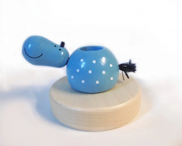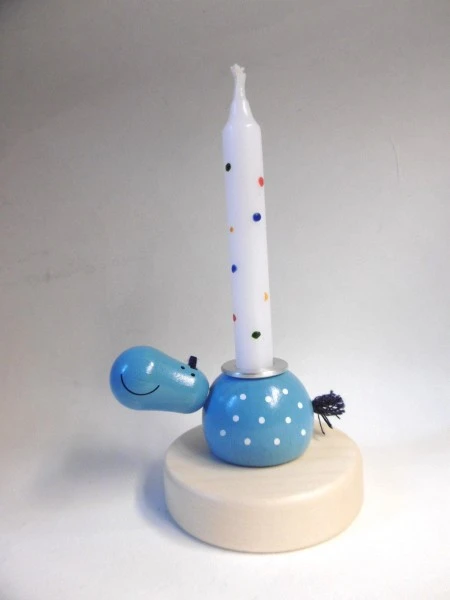 Hier als Kerzenhalter: Das lustige hellblaue Nilpferd mit lustigen weißen Punkten macht sich gut auf dem rundum-Geburtstagsring. Die Geburtstagstischdeko aus Holz hat einen besonderen Stil und ist sehr beliebt bei unseren Kunden. Das Nilpferd hat oben eine Mulde, in die die Kerzeneinsätze und Kerzen passen. Die Kerzen haben die typische Tannenbaumkerzengröße.