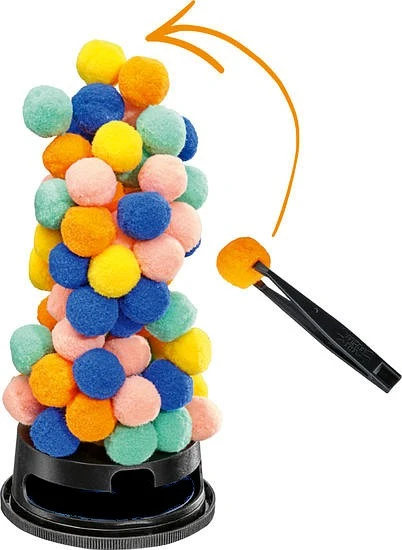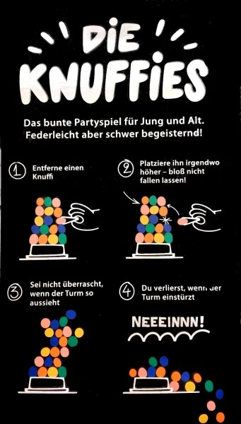 Die Knuffies ist ein superlustiges Familien- und Partyspiel von Schmidt Spiele mit dem ihr sicher viele gute Spieleabende haben werdet! Die kleinen knuffigen Spielbällchen werden in dem Becher (mit Sockel ca. 25cm hoch) zu einem Turm gepresst und dann aufgestellt. Nun kann man per Hand oder beiliegender Pinzette Bällchen von unten aus dem Turm zupfen und oben wieder aufsetzen. Das erinnert doch an …? Richtig – das Spielprinzip ist dem hölzernen Wackelturm sehr ähnlich. Bei den Knuffies ist aber alles weich und leise 😉 Dazu gibt es einen Spielkartenstapel. Die Spielkarten geben an, welche Farbe als nächstes gestapelt werden soll. Außerdem gibt es kleine „Strafaufgaben“, wenn man etwas fallengelassen hat, z.B. muss als nächstes die schwächere Hand verwendet werden oder ein Auge wird zugehalten. • ein Spiel für alle Altersstufen • Geschicklichkeit und Glück • Inhalt: 95 Bällchen, 30 Karten, 1 Pinzette, 1 Podest, 1 Becher, Anleitung
