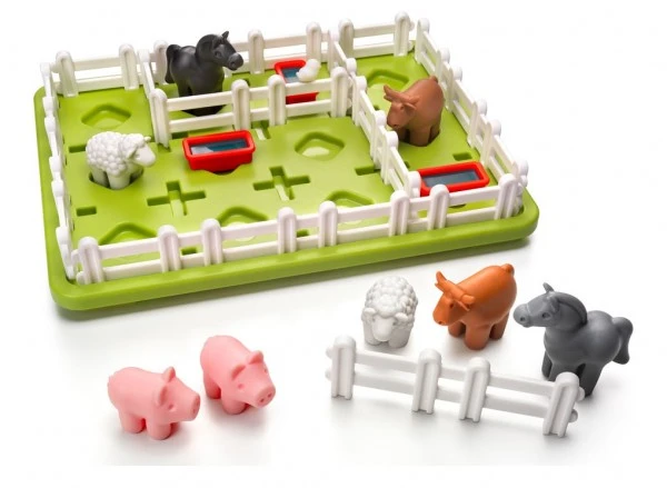 Die verschiedenen Tiere werden auf das Spielfeld gestellt, wie es die Aufgabenkarte vorgibt. Nun versucht man, mit den vorhandenen Zaunstücken nur gleiche Tiere zusammenzupferchen ohne die Tiere umzustellen. Gar nicht so leicht!