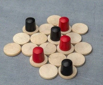 Gewonnen hat derjenige, welcher seine drei Figuren als erster auf den benachbarten Scheiben angeordnet hat.