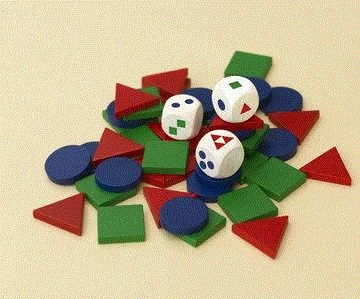 • Inhalt: 3 Spezialwürfel, 42 Handsteine (14 blaue Scheiben, 14 grüne Quadrate, 14 rote Dreiecke)