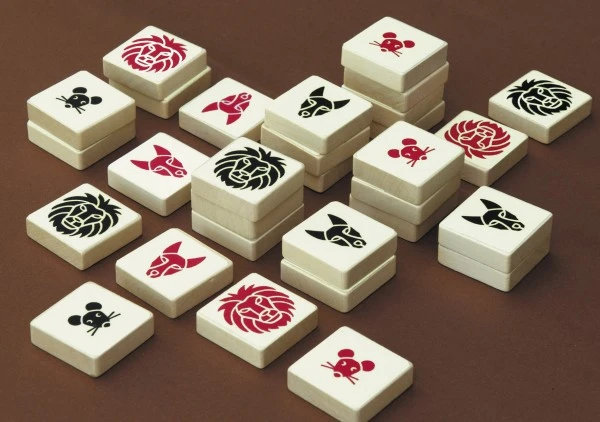 Bei TOKAN von Steffen-Spiele verfügt jede/r der zwei Spielende über ein Team aus Löwen, Schakalen und Mäusen – in rot oder in schwarz auf den Spielsteinen abgebildet.