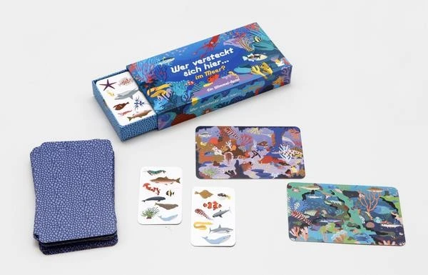 Beim Wimmelspiel Wer versteckt sich hier…im Meer? gilt es, den einen Meeresbewohner zu finden, der auf beiden Spielkarten versteckt ist. Dazu sind ein guter Blick und viel Konzentration nötig. Und natürlich viel gute Laune, denn bei diesen witzigen bunten Unterwasserwelten muss man einfach grinsen!